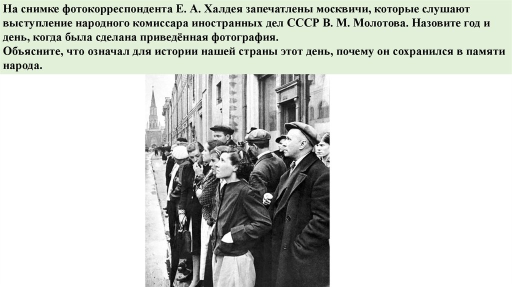 На снимке фотокорреспондента Е. А. Халдея запечатлены москвичи, которые слушаютвыступление народного комиссара иностранных дел СССР В. М. Молотова. Назовите год и