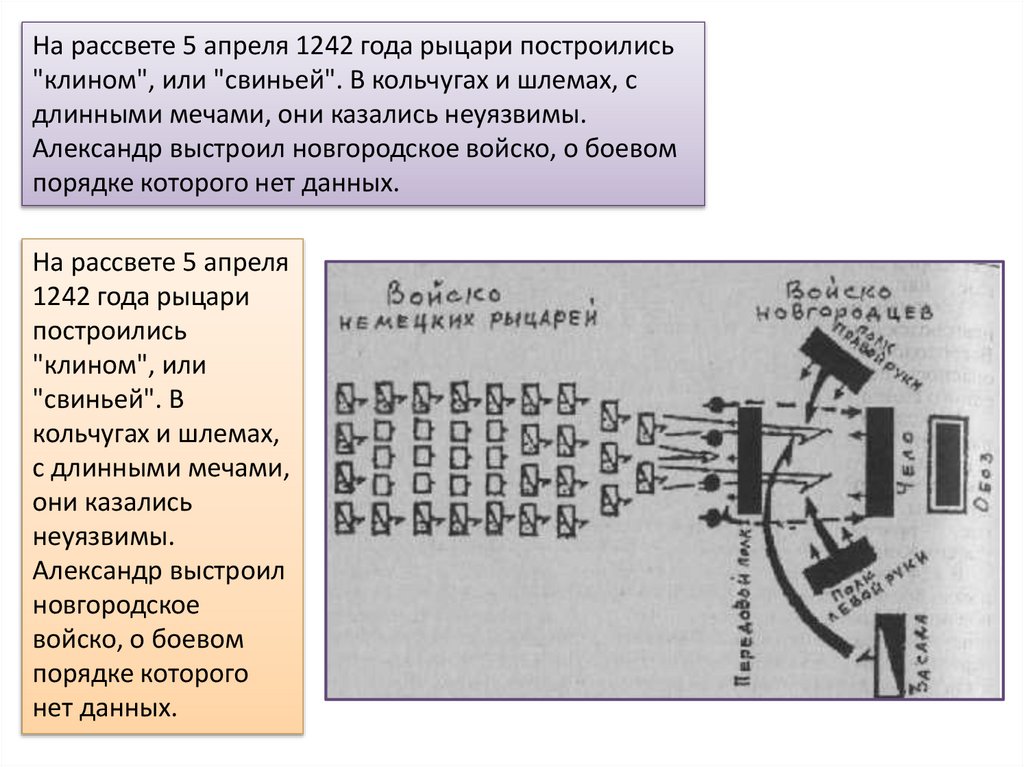 На рассвете 5 апреля 1242 года рыцари построились"клином", или "свиньей". В кольчугах и шлемах, с