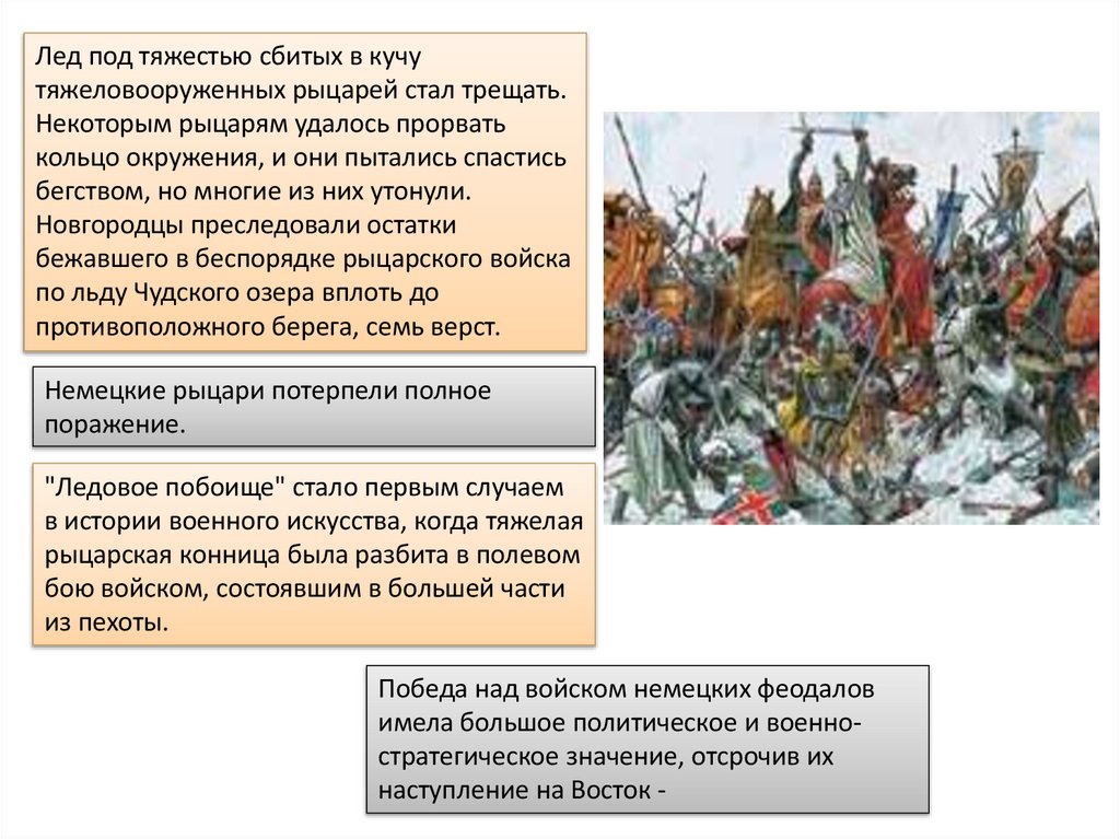 Лед под тяжестью сбитых в кучутяжеловооруженных рыцарей стал трещать.