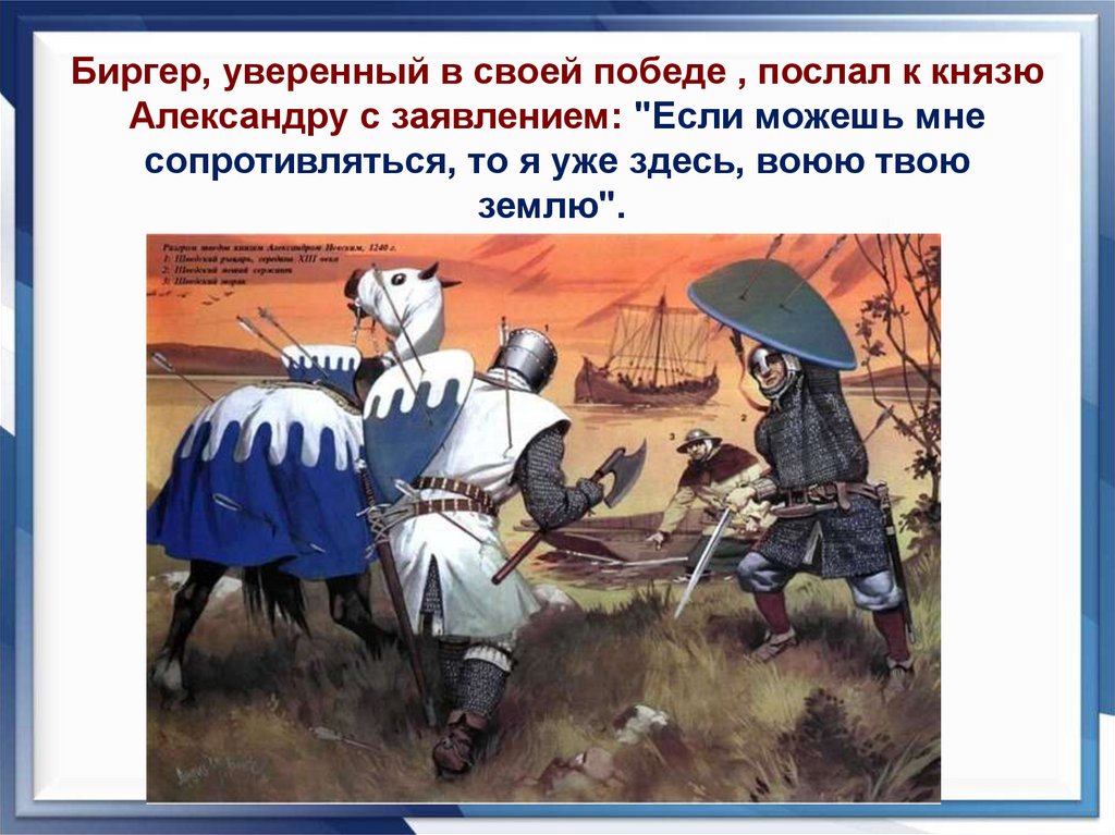 Биргер, уверенный в своей победе , послал к князюАлександру с заявлением: "Если можешь мне