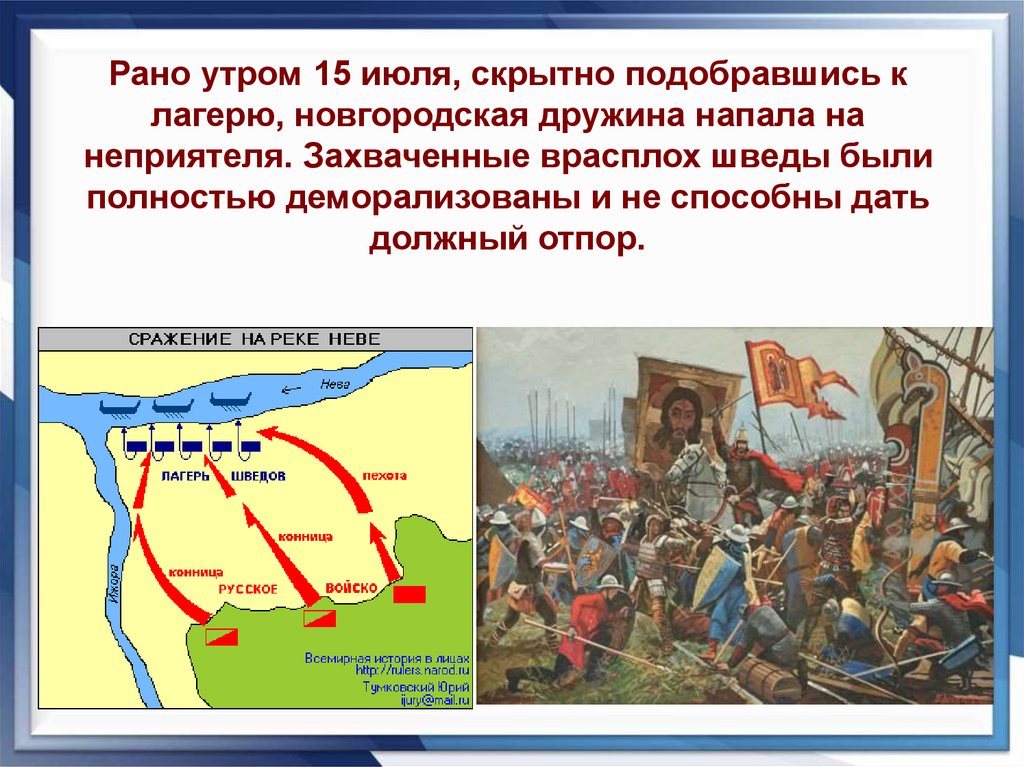 Рано утром 15 июля, скрытно подобравшись клагерю, новгородская дружина напала на
