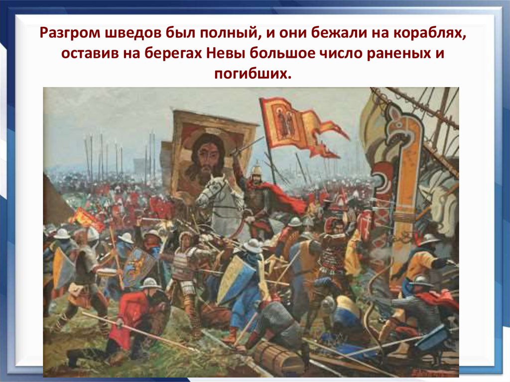 Разгром шведов был полный, и они бежали на кораблях,оставив на берегах Невы большое число раненых и