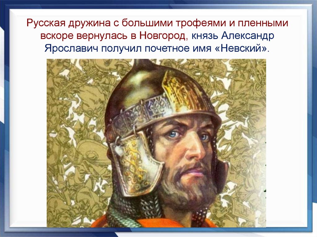 Русская дружина с большими трофеями и пленнымивскоре вернулась в Новгород, князь Александр