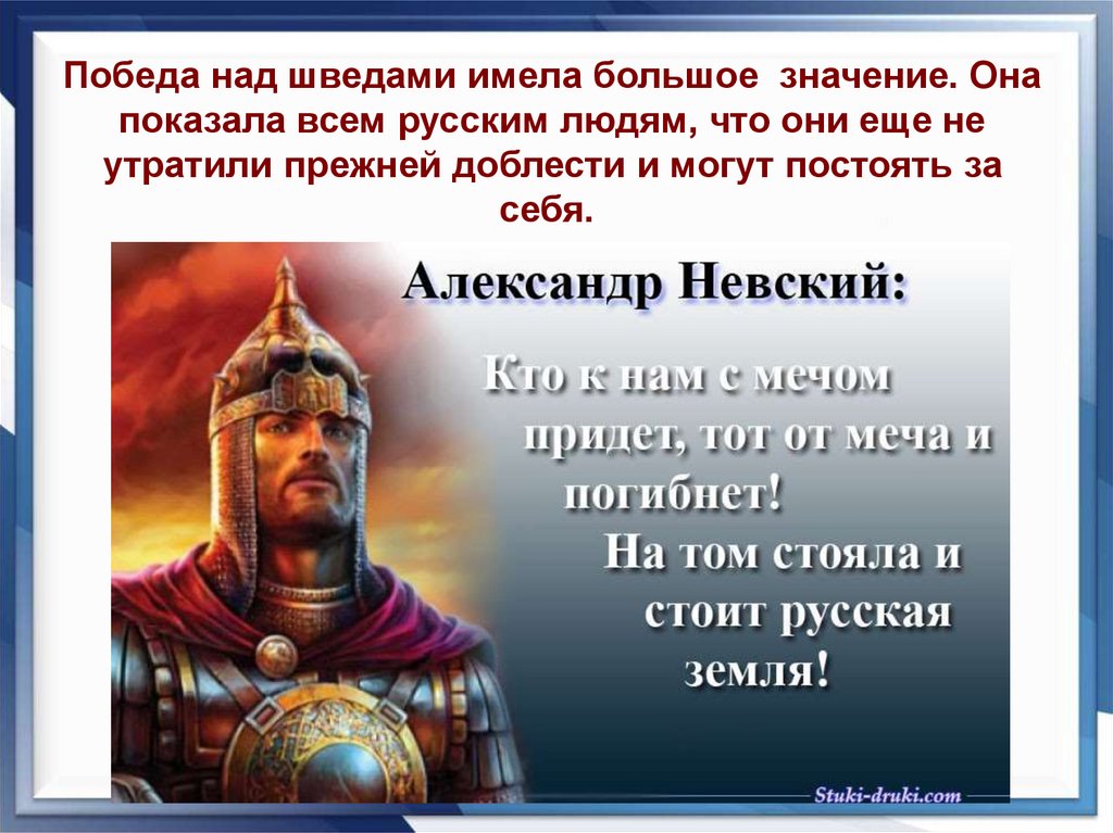 Победа над шведами имела большое значение. Онапоказала всем русским людям, что они еще не