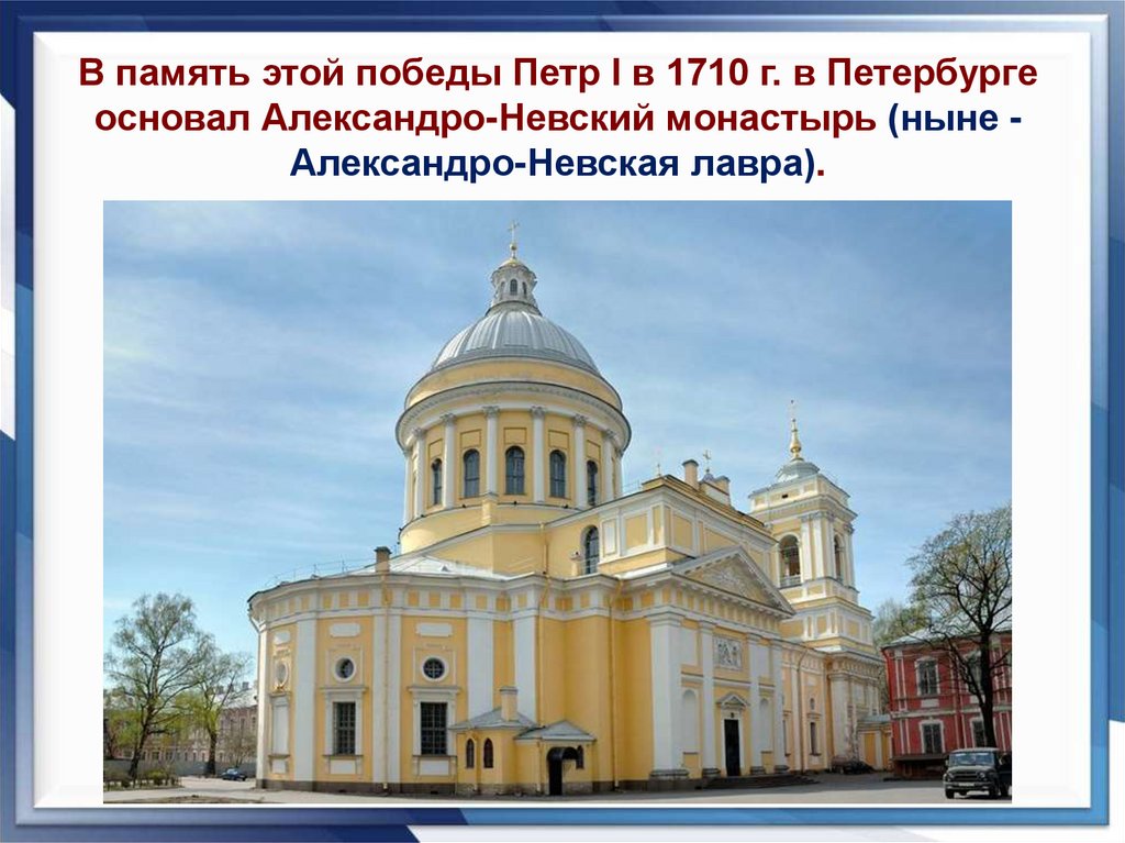 В память этой победы Петр I в 1710 г. в Петербургеосновал Александро-Невский монастырь (ныне Александро-Невская лавра).