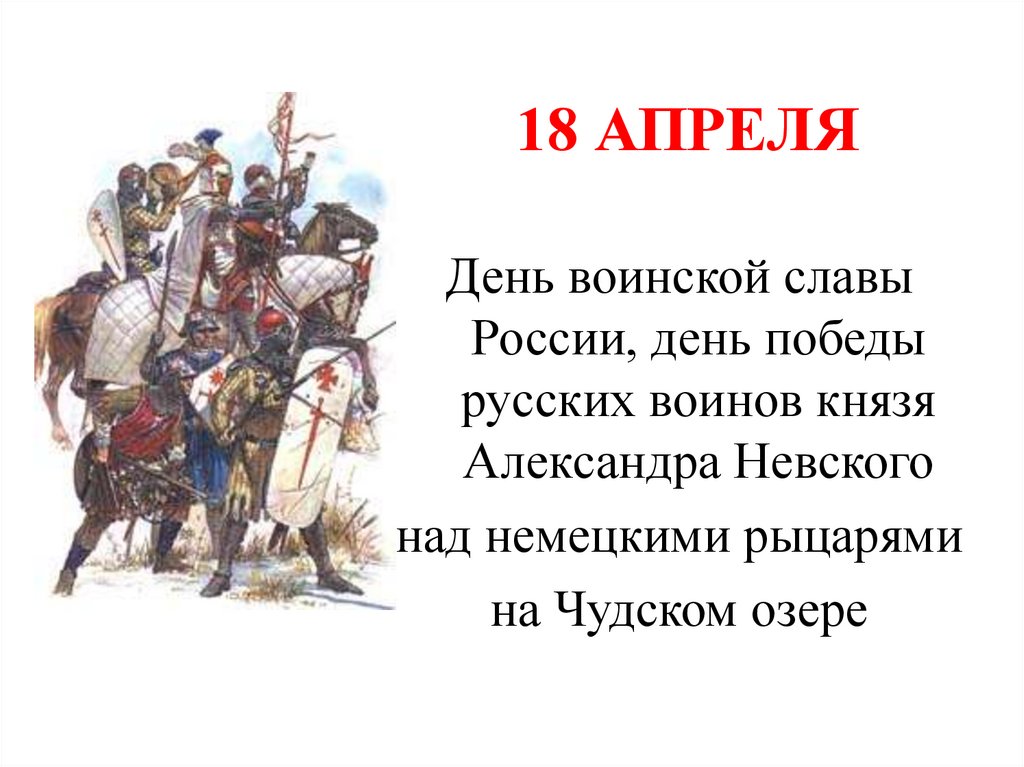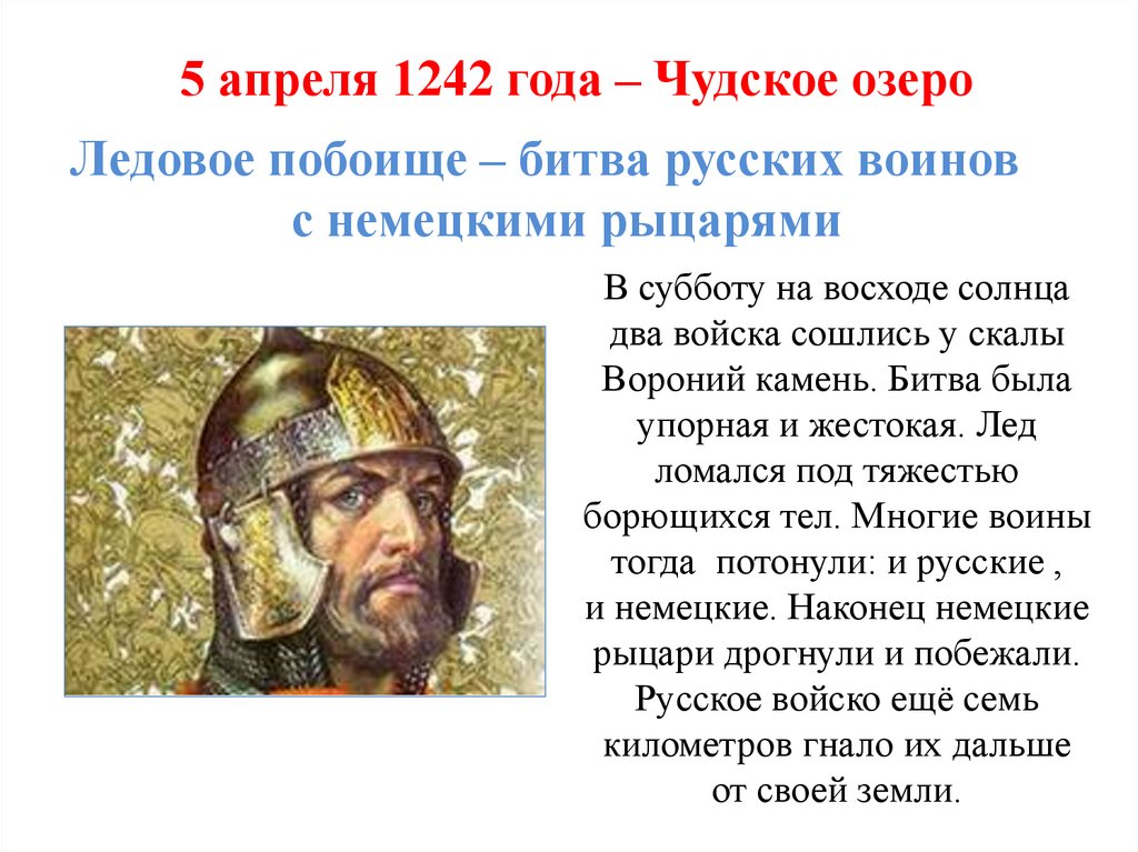 5 апреля 1242 года – Чудское озероЛедовое побоище – битва русских воинов