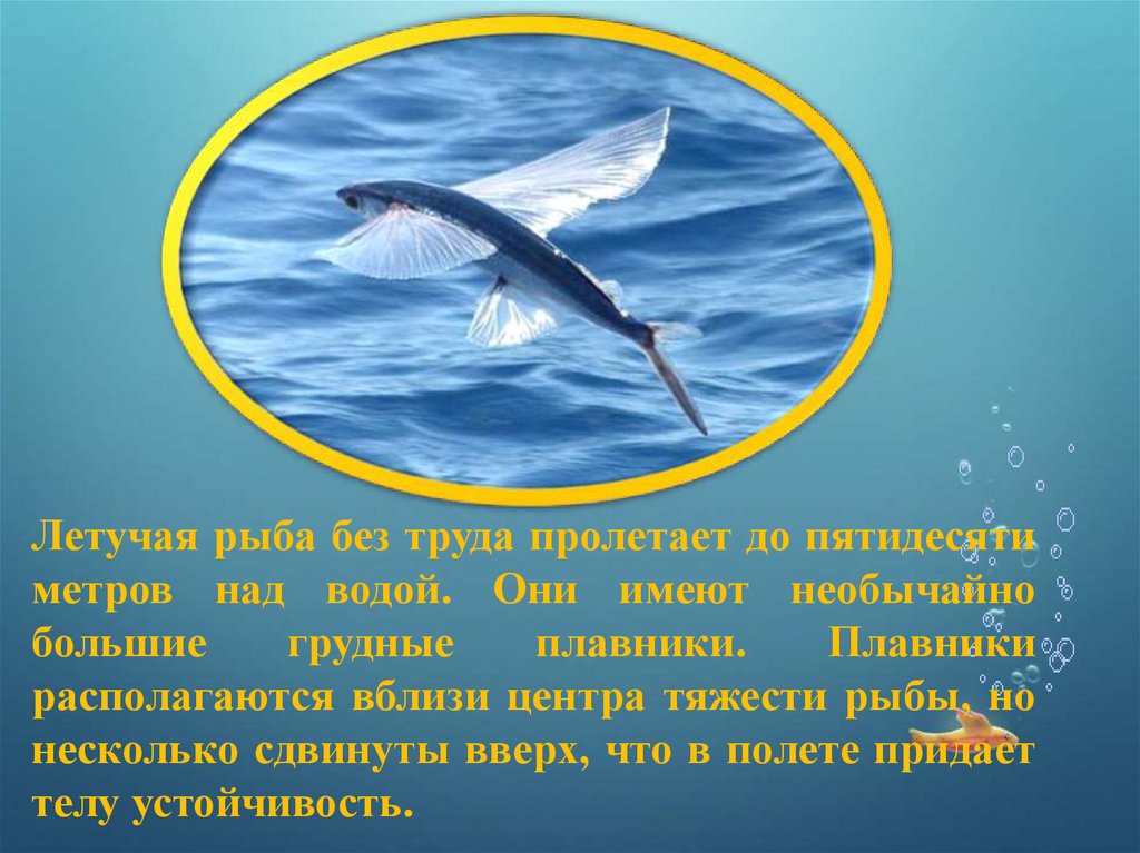 Летучая рыба без труда пролетает до пятидесятиметров над водой. Они имеют необычайно