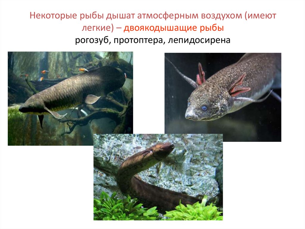 Некоторые рыбы дышат атмосферным воздухом (имеютлегкие) – двоякодышащие рыбы