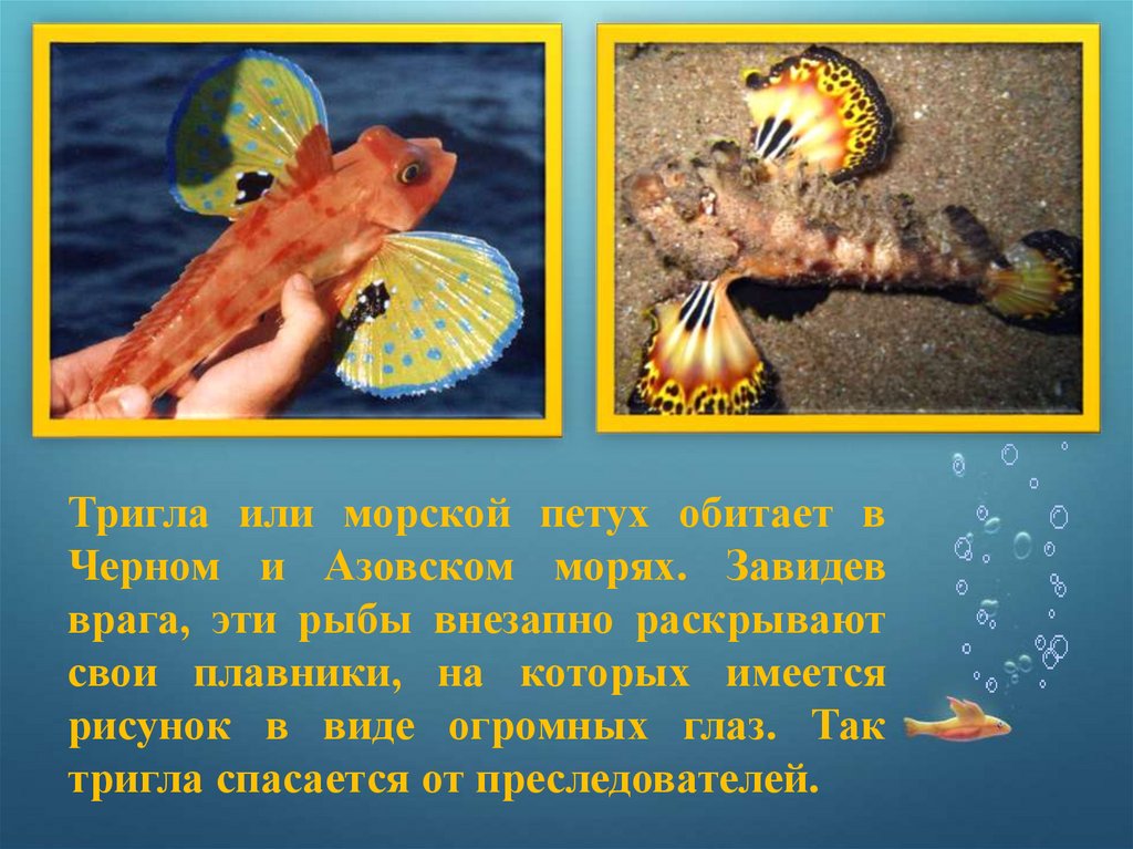 Тригла или морской петух обитает вЧерном и Азовском морях. Завидев