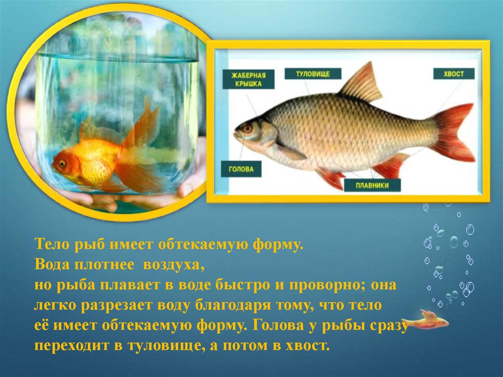 Тело рыб имеет обтекаемую форму.Вода плотнее воздуха,
