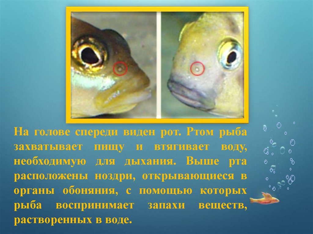 На голове спереди виден рот. Ртом рыбазахватывает пищу и втягивает воду,