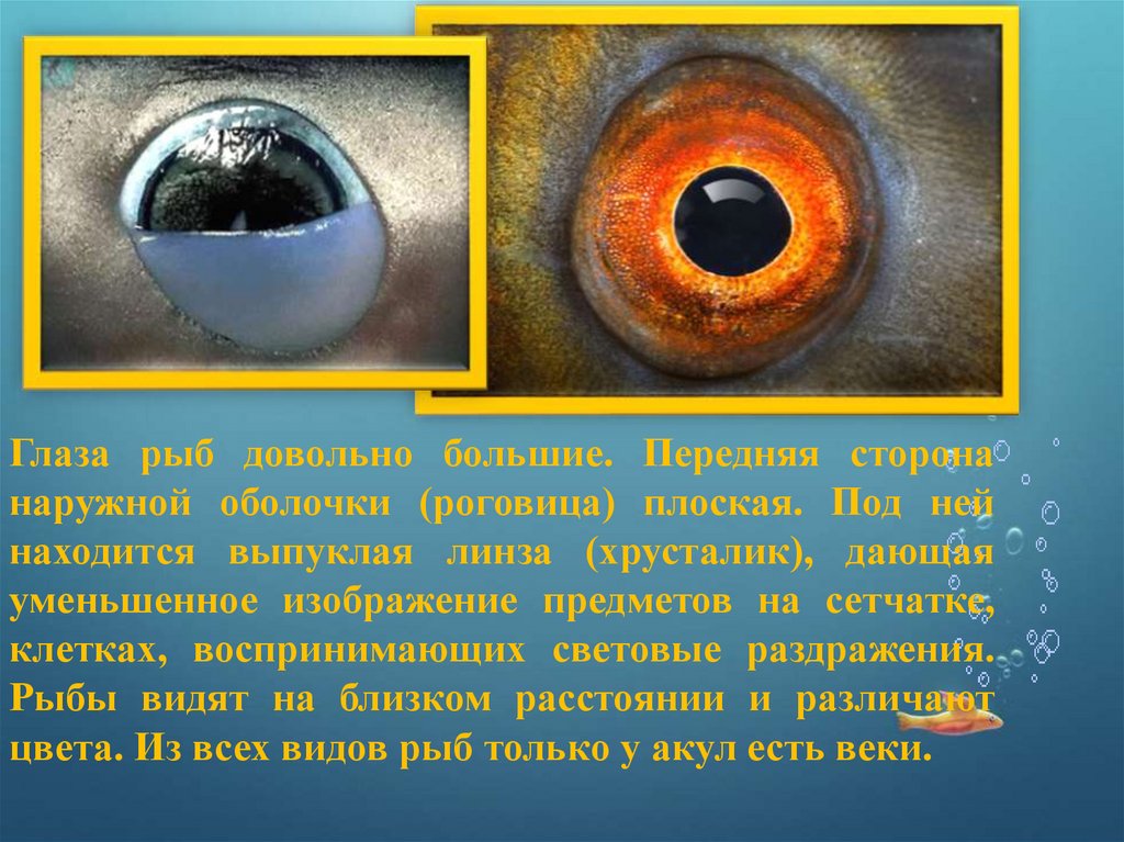 Глаза рыб довольно большие. Передняя сторонанаружной оболочки (роговица) плоская. Под ней