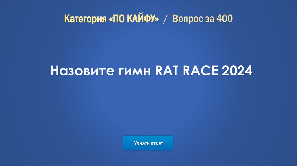 Категория «ПО КАЙФУ» / Вопрос за 400Назовите гимн RAT RACE 2024