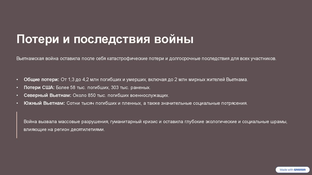 Потери и последствия войныВьетнамская война оставила после себя катастрофические потери и долгосрочные последствия для всех участников.