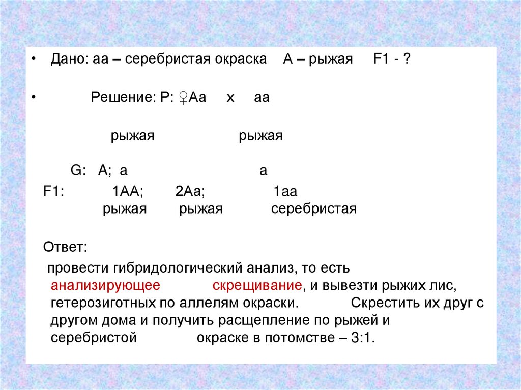 • Если F1: Aa, аа – значит щенок имеет генотип