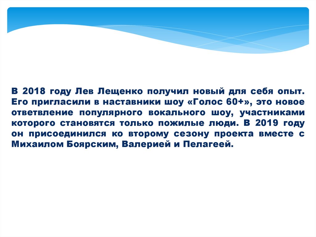 В 2018 году Лев Лещенко получил новый для себя опыт.Его пригласили в наставники шоу «Голос 60+», это новое
