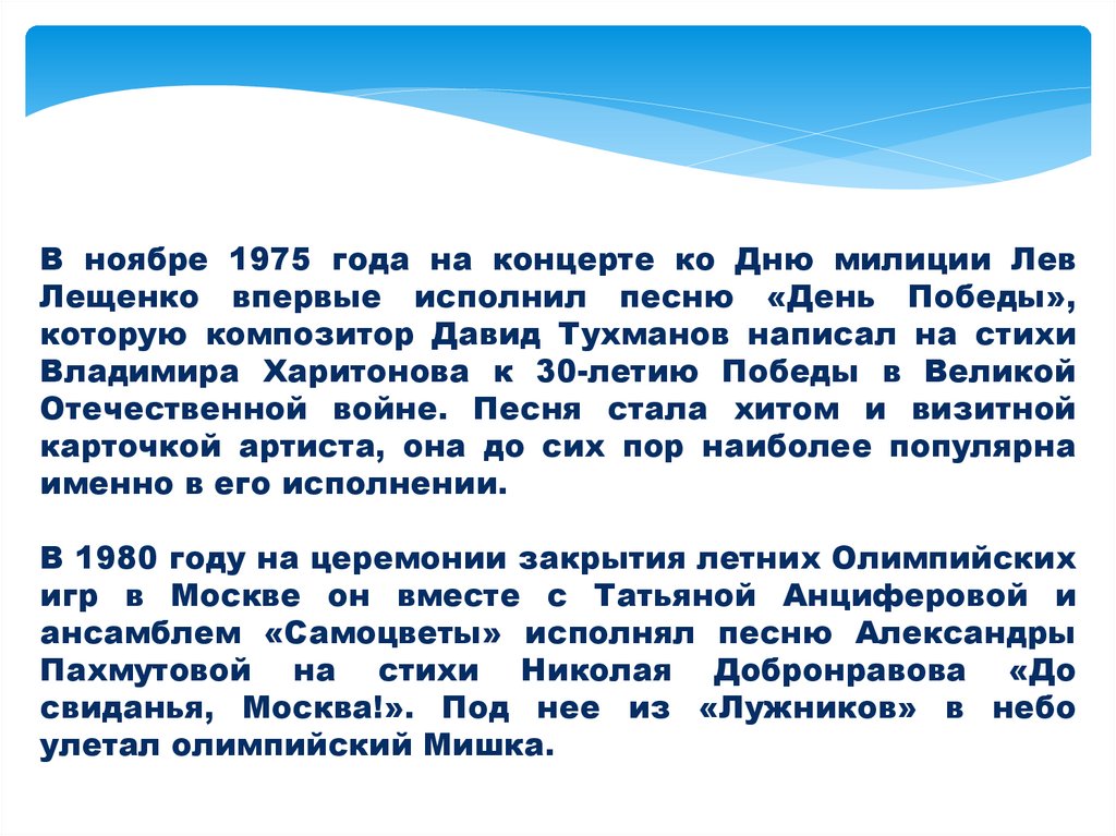 В ноябре 1975 года на концерте ко Дню милиции ЛевЛещенко впервые исполнил песню «День Победы»,