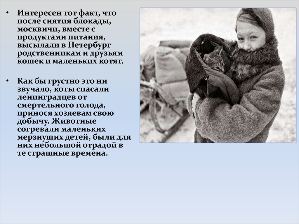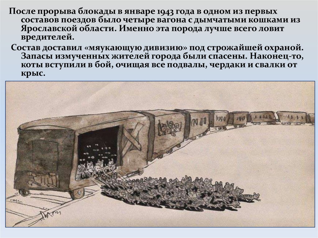 После прорыва блокады в январе 1943 года в одном из первыхсоставов поездов было четыре вагона с дымчатыми кошками из