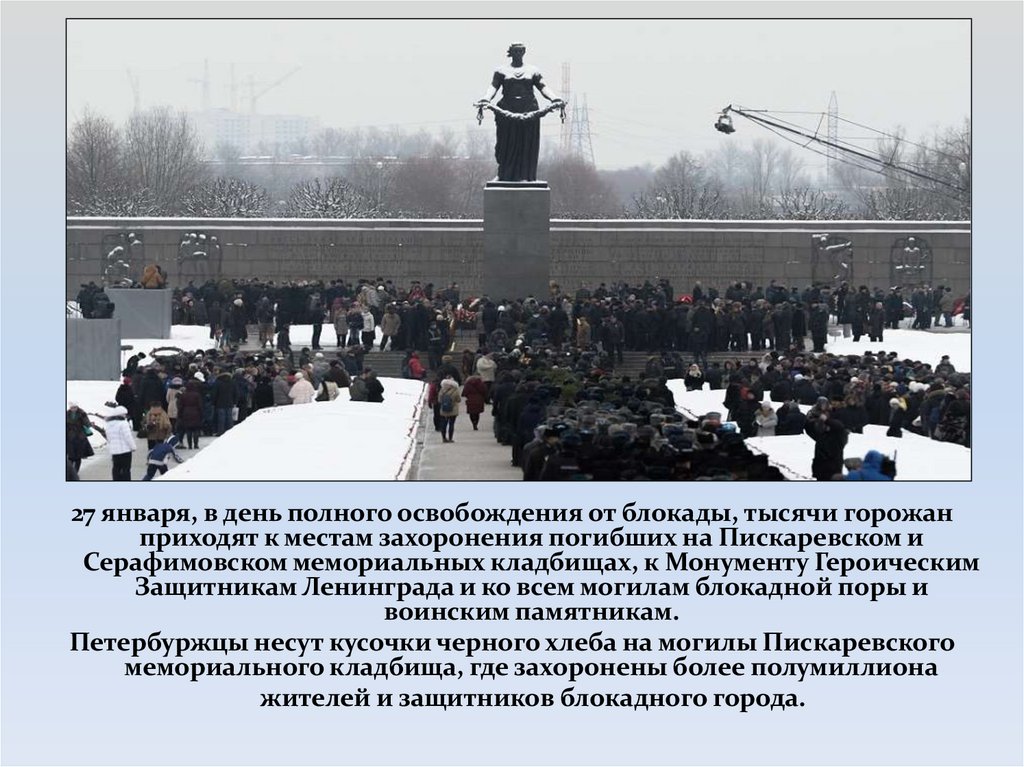 27 января, в день полного освобождения от блокады, тысячи горожанприходят к местам захоронения погибших на Пискаревском и