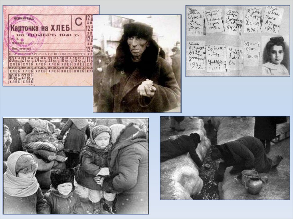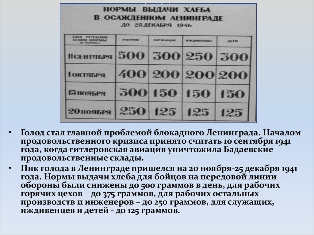 • Голод стал главной проблемой блокадного Ленинграда. Началомпродовольственного кризиса принято считать 10 сентября 1941