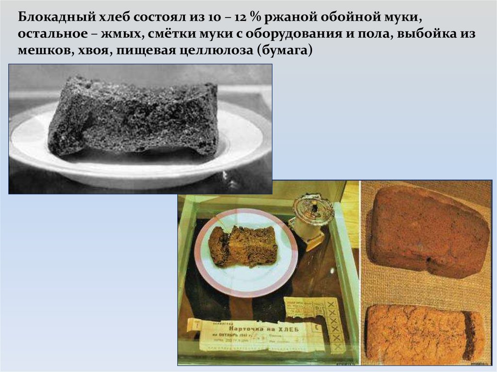 Блокадный хлеб состоял из 10 – 12 % ржаной обойной муки,остальное – жмых, смётки муки с оборудования и пола, выбойка из