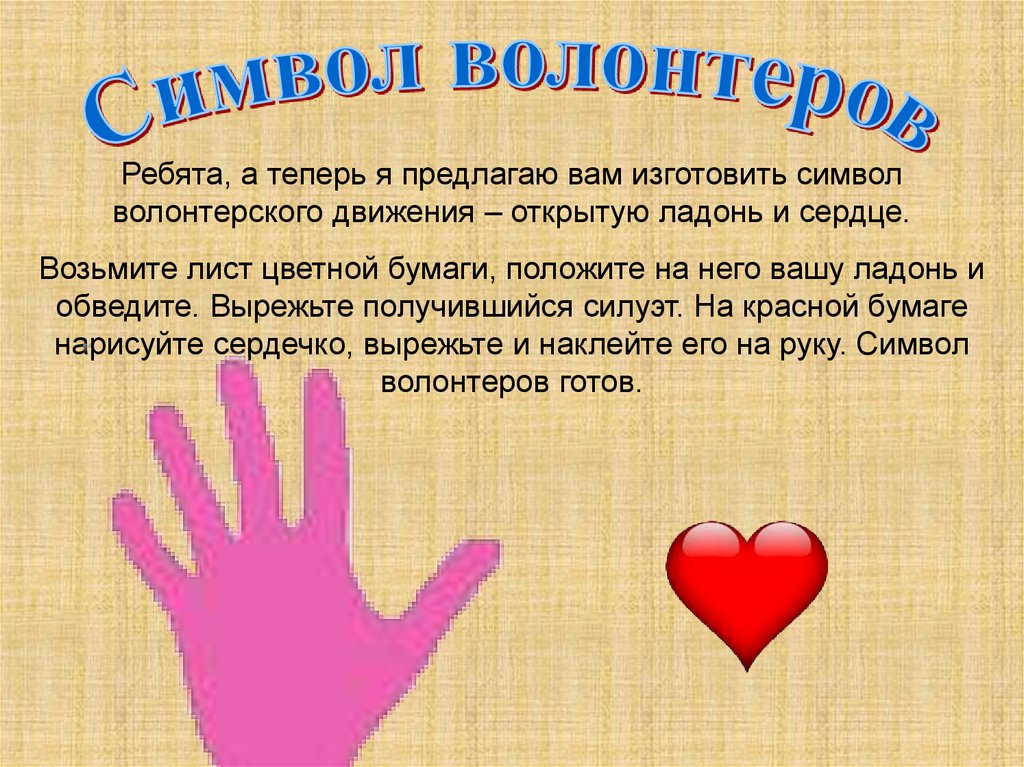 Ребята, а теперь я предлагаю вам изготовить символволонтерского движения – открытую ладонь и сердце.