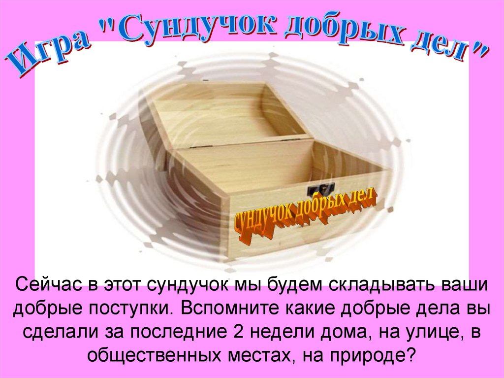 Сейчас в этот сундучок мы будем складывать вашидобрые поступки. Вспомните какие добрые дела вы