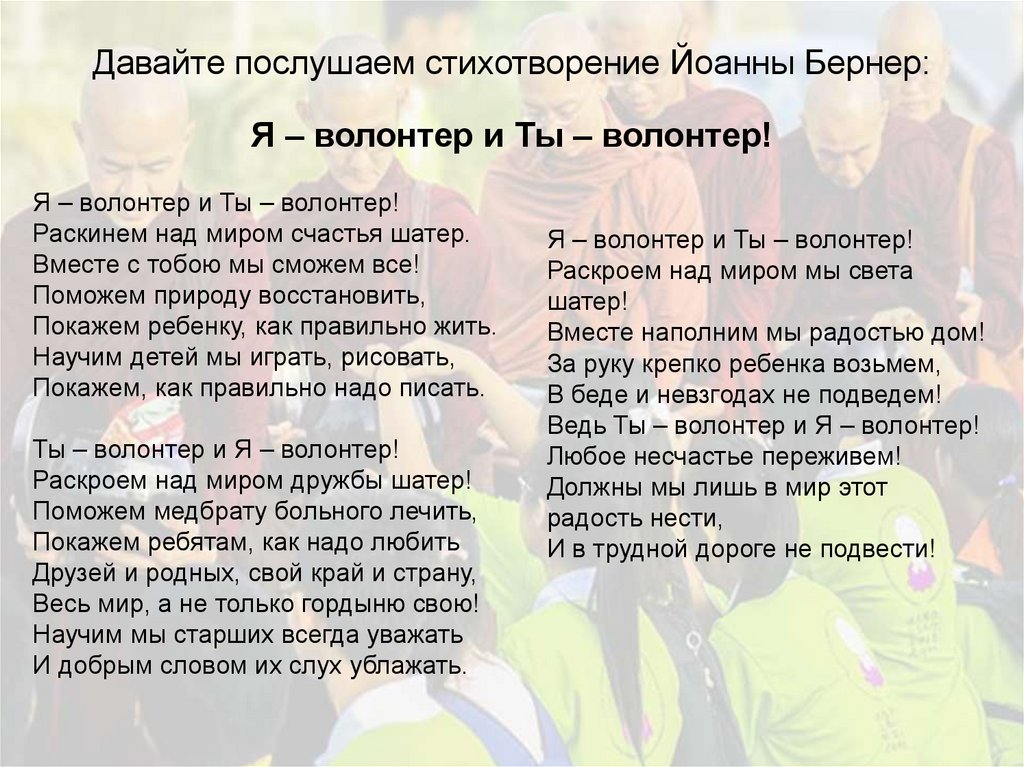 Давайте послушаем стихотворение Йоанны Бернер:Я – волонтер и Ты – волонтер!