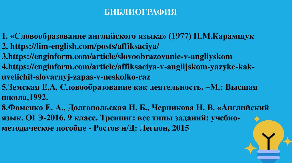 БИБЛИОГРАФИЯ1. «Словообразование английского языка» (1977) П.М.Карамщук
