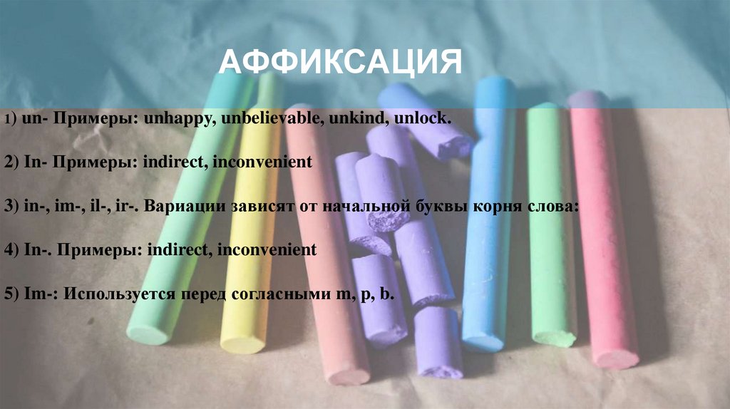 АФФИКСАЦИЯ1) un- Примеры: unhappy, unbelievable, unkind, unlock.