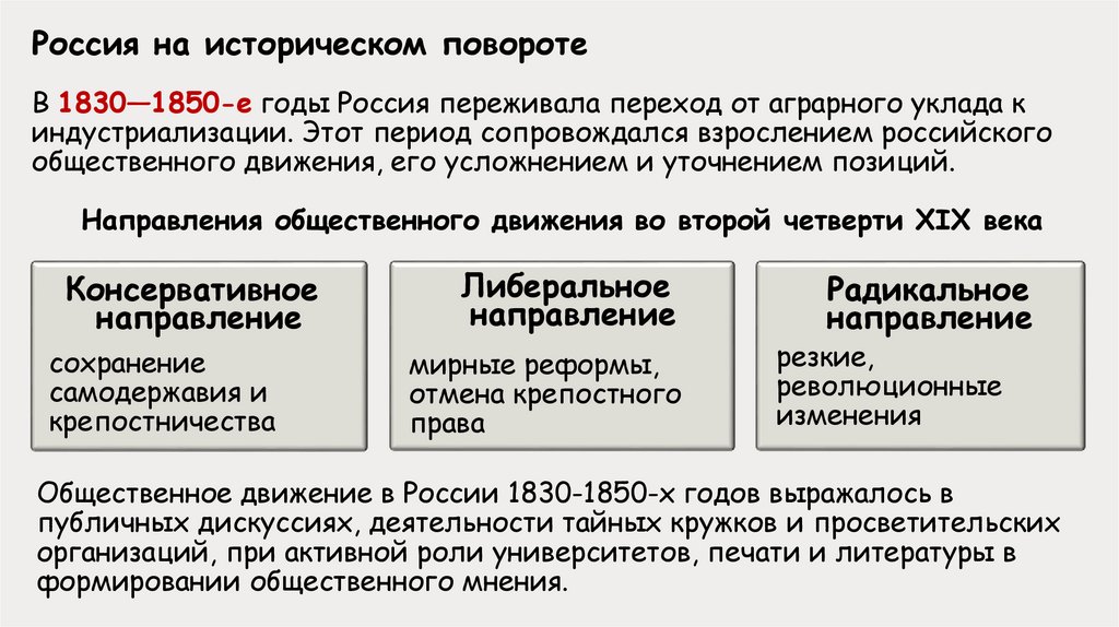 Россия на историческом поворотеВ 1830—1850-е годы Россия переживала переход от аграрного уклада к