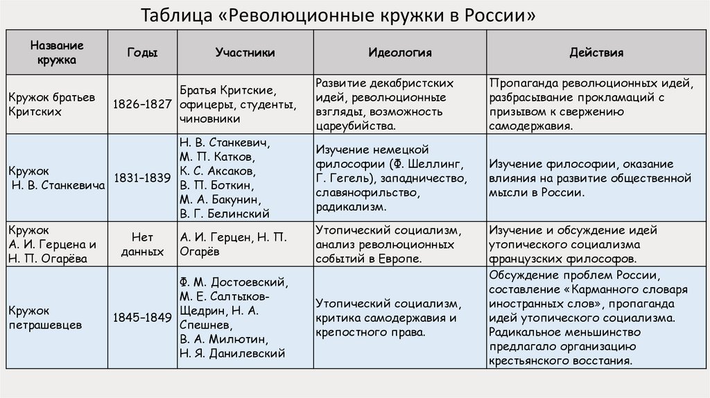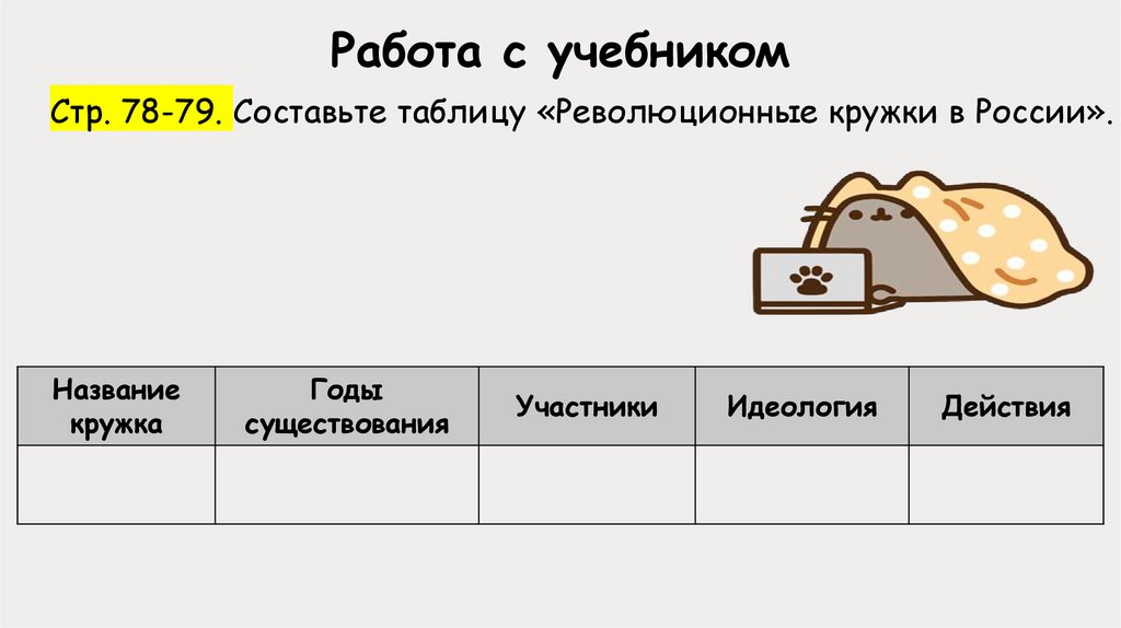 Работа с учебникомСтр. 78-79. Составьте таблицу «Революционные кружки в России».