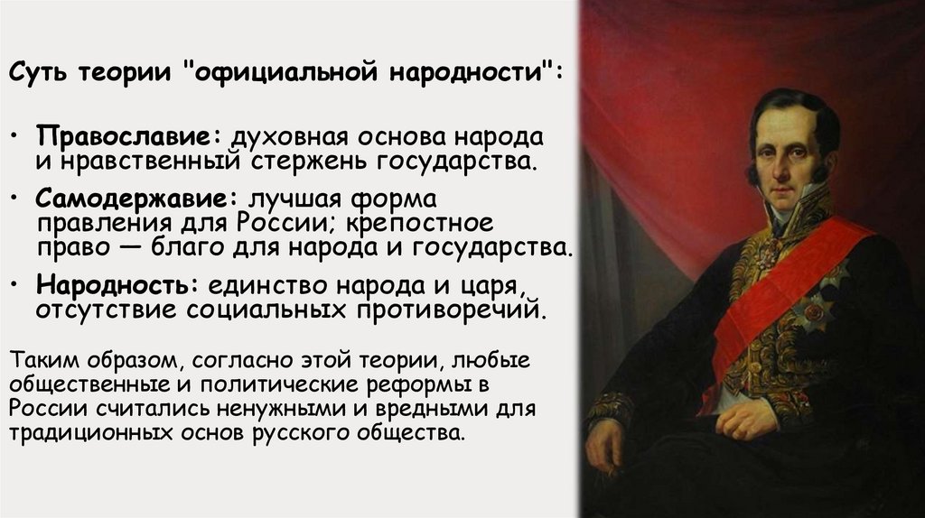 Суть теории "официальной народности":• Православие: духовная основа народа
