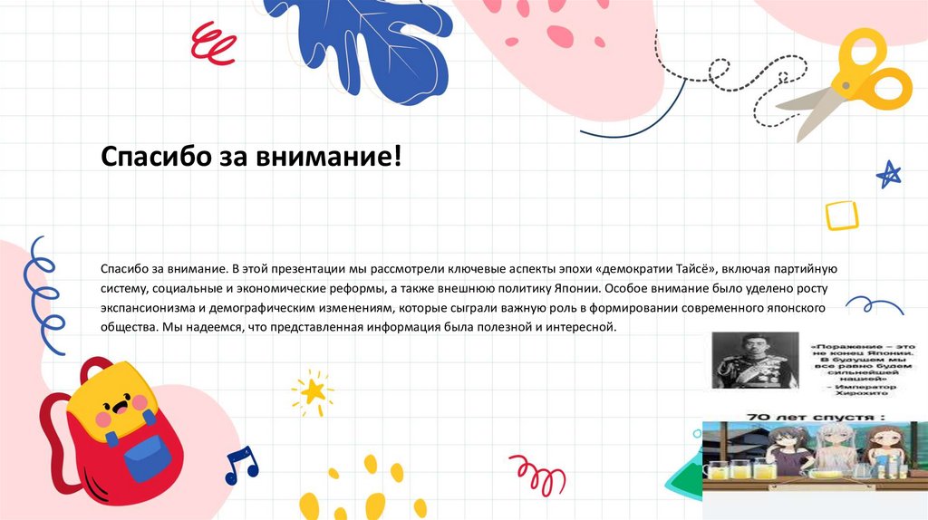 Спасибо за внимание!Спасибо за внимание. В этой презентации мы рассмотрели ключевые аспекты эпохи «демократии Тайсё», включая партийную