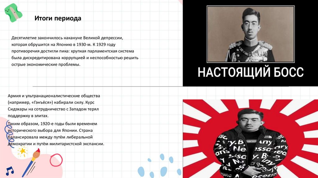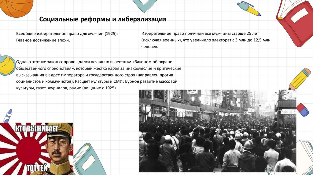 систему, социальные и экономические реформы, а также внешнюю политику Японии. Особое внимание было уделено росту