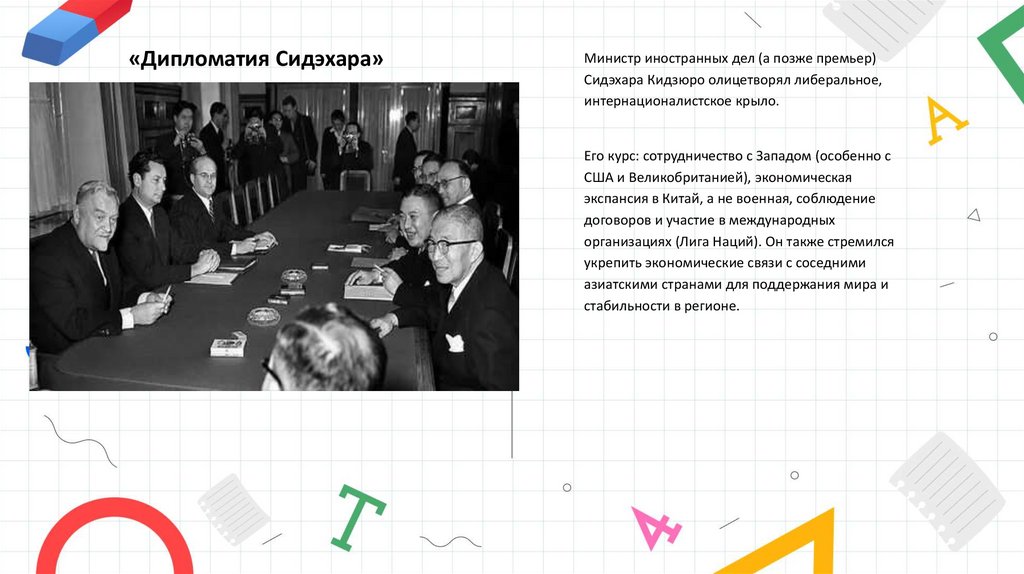 «Дипломатия Сидэхара»Министр иностранных дел (а позже премьер)
