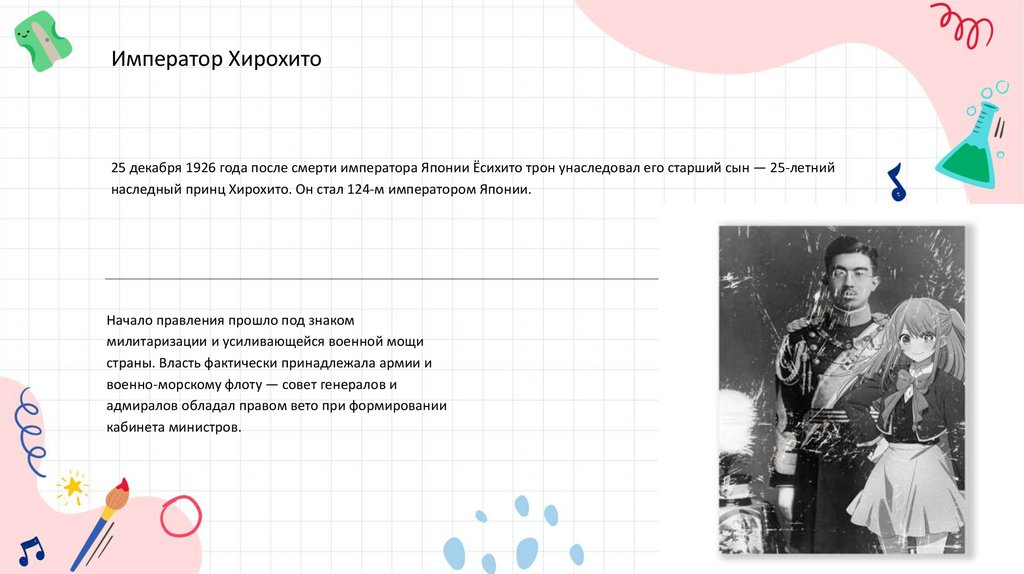 Император Хирохито25 декабря 1926 года после смерти императора Японии Ёсихито трон унаследовал его старший сын — 25-летний