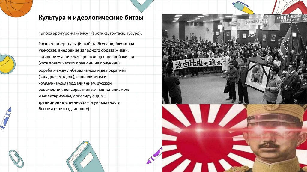 Культура и идеологические битвы«Эпоха эро-гуро-нансэнсу» (эротика, гротеск, абсурд).