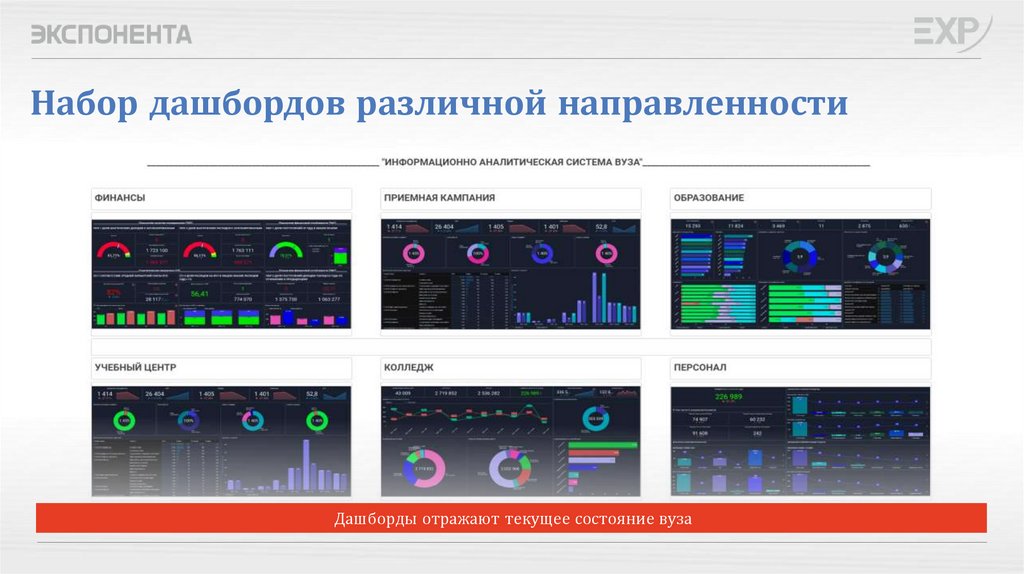 Набор дашбордов различной направленностиДашборды отражают текущее состояние вуза