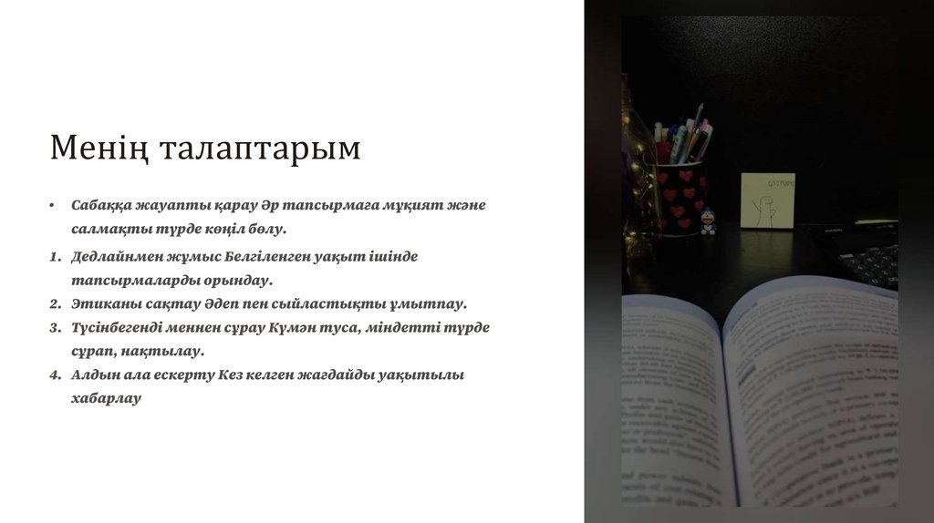 Менің талаптарымСабаққа жауапты қарау Әр тапсырмаға мұқият және