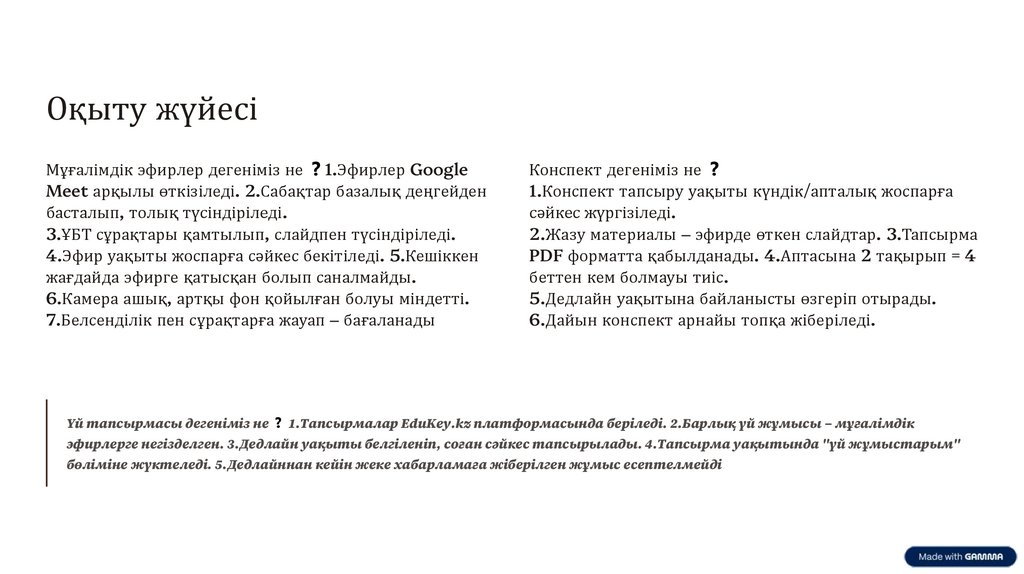 эфирлерге негізделген. 3.Дедлайн уақыты белгіленіп, соған сәйкес тапсырылады. 4.Тапсырма уақытында "үй жұмыстарым"