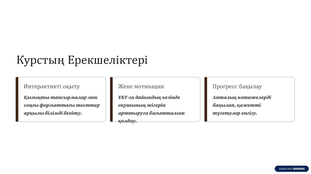 Курстың МақсатыБіздің курсымыздың негізгі мақсаты – сізді ҰБТ-ға толық дайындап, сенімділік сыйлау.