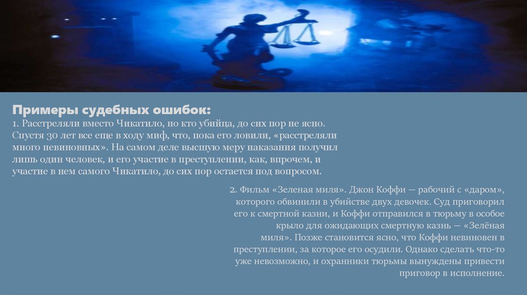 Примеры судебных ошибок:1. Расстреляли вместо Чикатило, но кто убийца, до сих пор не ясно.