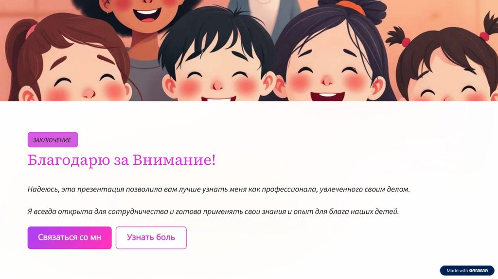 Я всегда открыта для сотрудничества и готова применять свои знания и опыт для блага наших детей.