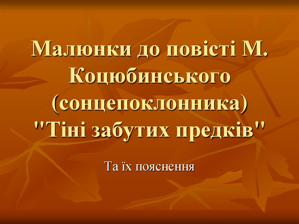 1. Малюнки до повісті М. Коцюбинського (сонцепоклонника) "Тіні забутих предків"
