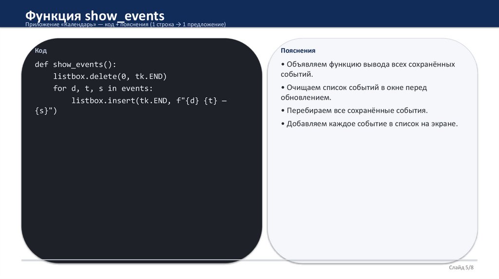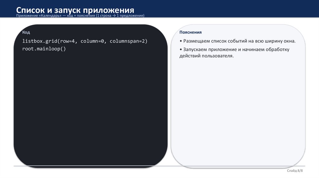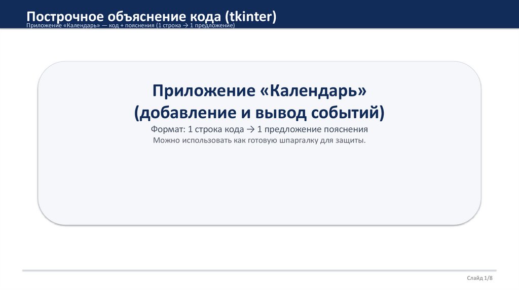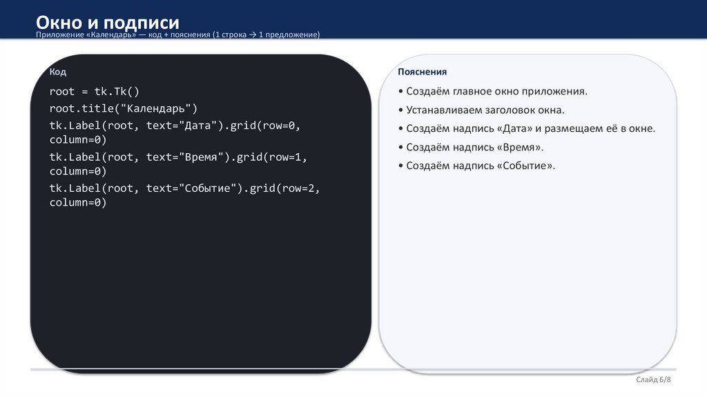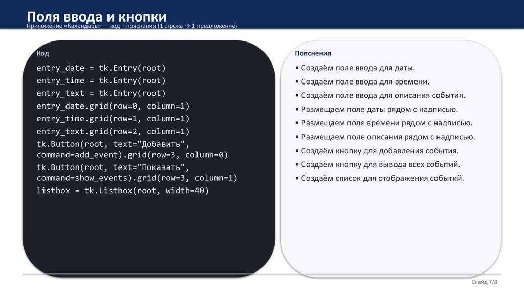 Приложение «Календарь» — код + пояснения (1 строка → 1 предложение)