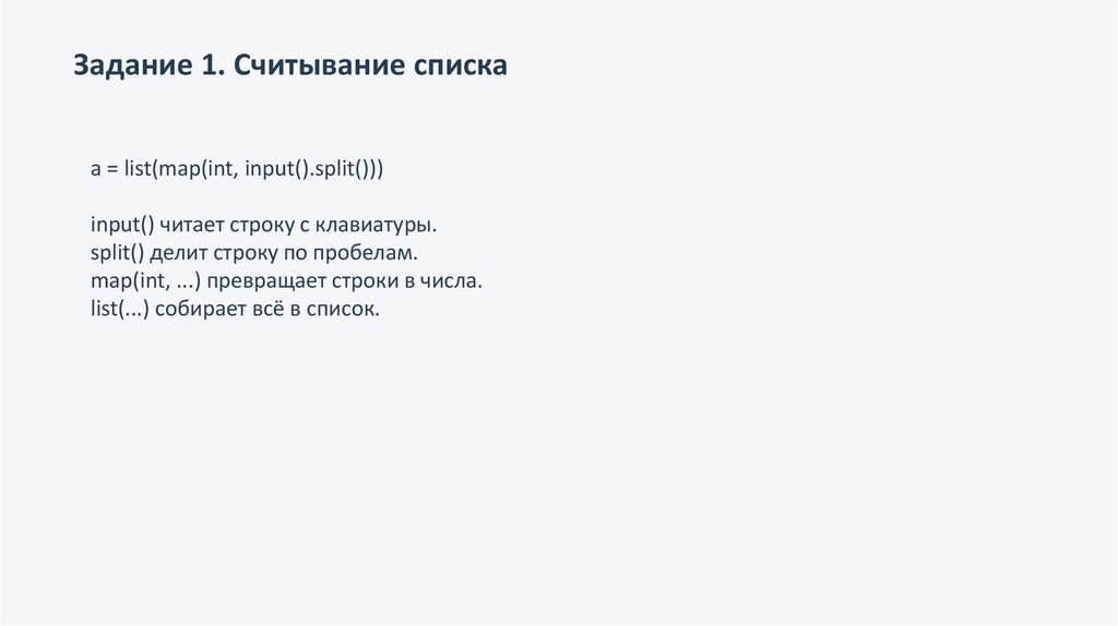 Задание 1. Считывание спискаa = list(map(int, input().split()))