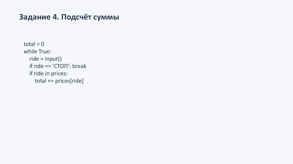 Задание 4. Подсчёт суммыtotal = 0