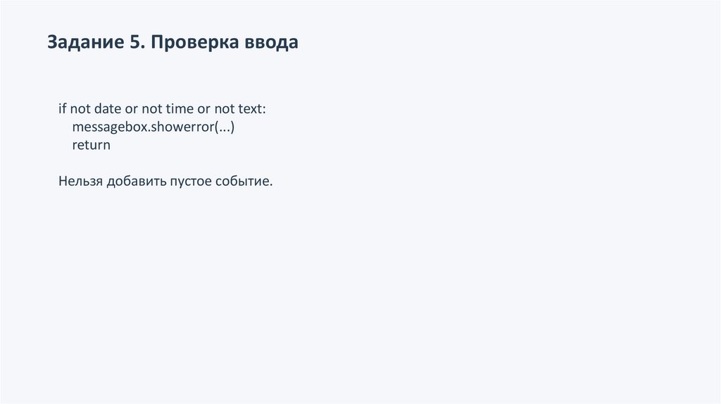 Задание 5. Проверка вводаif not date or not time or not text: