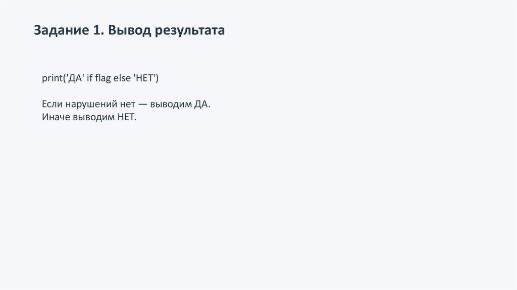 Задание 1. Вывод результатаprint('ДА' if flag else 'НЕТ')